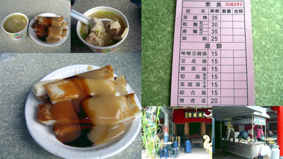 斗六保安宮的素食早餐其實斗六市區不大,但是素食店不少,素食早餐也有不少選擇,只是以網路上的知名度而言,斗六保安宮素食好像還算小有名氣,一盤蘿蔔糕大約是5-6片長條狀蘿蔔糕 淋上大量的山海醬跟一點醬油 還可自行加辣醬 一盤要價35元。一碗15元的味噌湯,豆腐份量之多,完全超乎天龍人之想像,不過斗六其他間素食小吃店,還有賣一碗10元的味噌湯喔。從早上5點多開賣,大約10點多左右就會陸續賣完收攤,生意很好。斗六 保安宮素食地址:斗六市內環路、大同路口