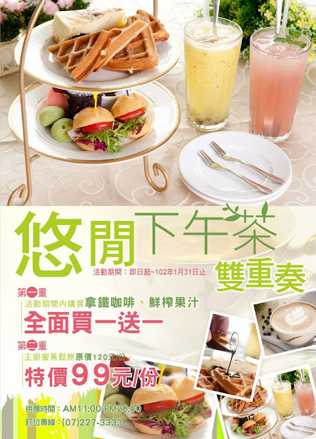高雄市民有福啦~ 下午茶咖啡及新鮮果汁買一送一、蜜蕉鬆餅現正特價促銷ING 。大家一起快快來嚐鮮吧。凡於戶外休閒區用餐免收一成服務費且提供外帶服務唷。訂位專線:007-227-3333。地址:高雄市新興區民生一路23號