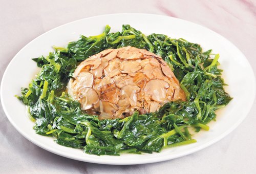 2.將筍翅、大白菜燒入味,放入扣碗裡。